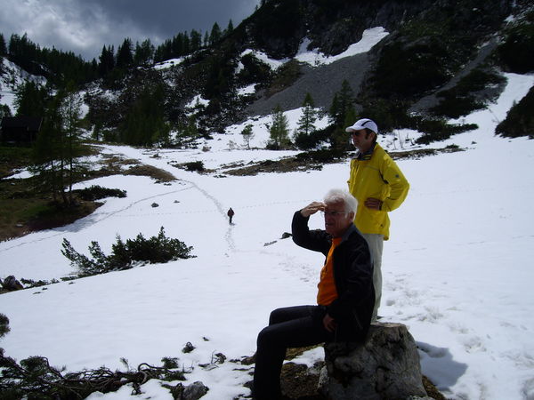 Der Weg führt jetzt über lange Schneefelder. Trotz der dunklen Wolken am Himmel könnte man Sonnenbrillen gut gebrauchen.