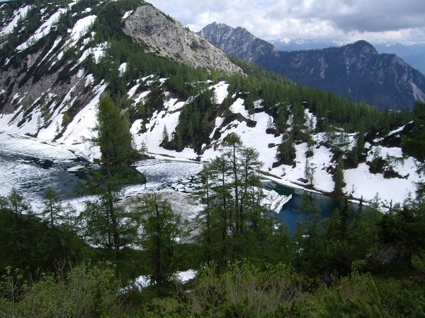 Nur an wenigen Stellen gibt es offenes Wasser. Die Abhänge sich teilweise noch mit mehreren Metern Schnee bedeckt.