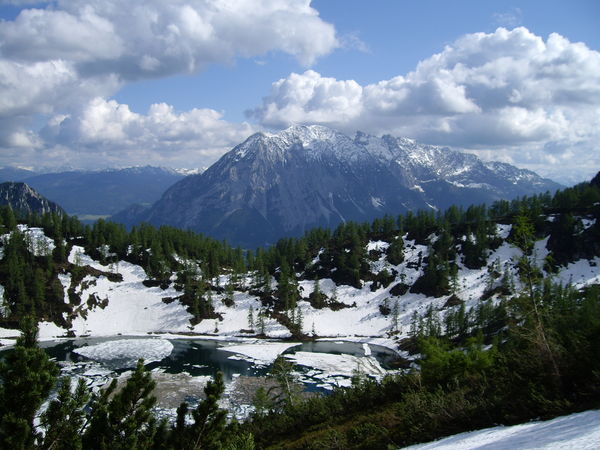 Vor uns liegt der Grimming (2370m). Richtung Süden scheint die Altschneedecke schnell abzunehmen, so dass wir hoffen können, auf unserer Wanderung gute Verhältnisse vorzufinden.