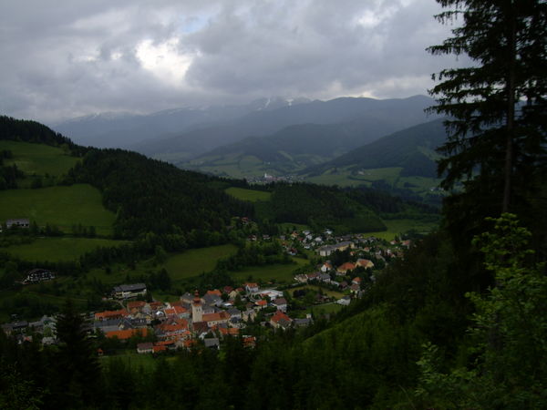 Wir haben es gar nicht eilig, sondern steigen gemächlich nach Oberzeiring ab, wo wir im Grünen Specht zu Abend essen. Nach dem Abendessen hatte sich der Regenschauer über St. Oswald nach Norden verzogen und wir können trockenen Fußes unseren Weg fortsetzen. Der Wirt des grünen Specht hat ein Einsehen und hilft Roland weiter.