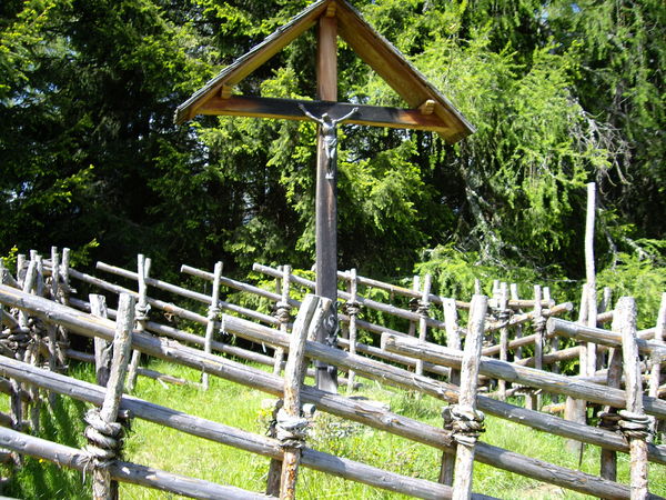 Ein nach uraltem Verfahren gefertigter Zaun schützt dieses Wegkreuz.