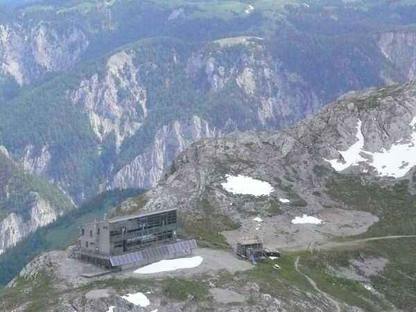 Knapp unterhalb des Gipfels liegt der Neubau des Schiestl-Hauses, sehr umweltfreundlich, Millionen Euro teuer und mit den höchsten Bierpreisen der Ostalpen.