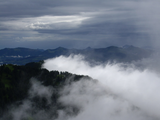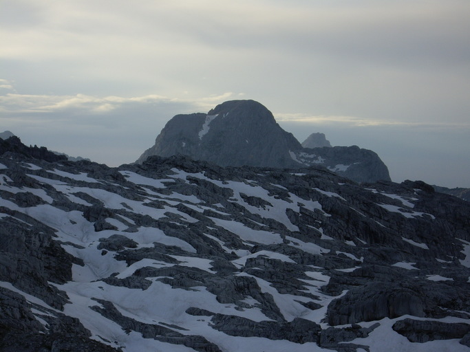 Als wir gegen 17 Uhr endlich zum Stahl-Haus absteigen setzt ein Regenschauer ein, der aber nach dem Abendessen wieder abgeklungen ist, so dass wir noch einen Spaziergang zum Jennergipel unternehmen. Es ist bereits spät abends und so geben die Wolken den Blick frei auf das Hohe Brett, über das wir vom Göll zur Hütte gelangten.