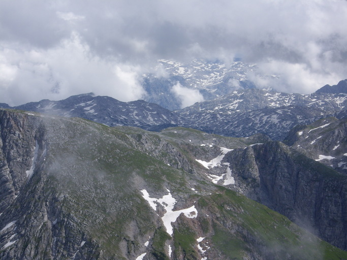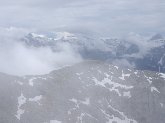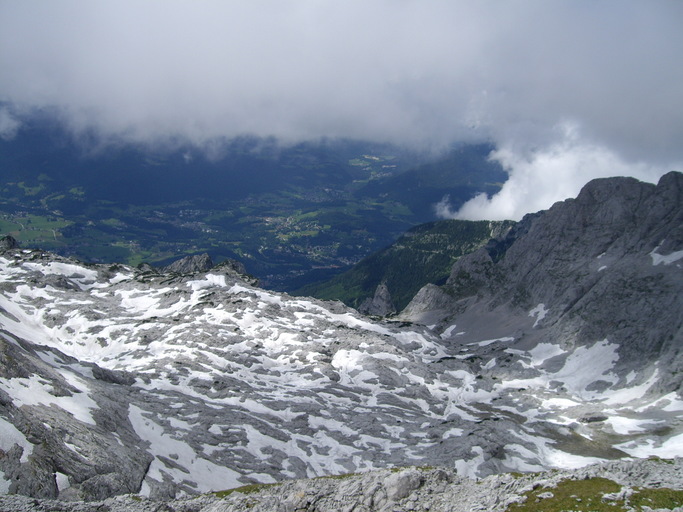 Nur selten geben die Wolken den Blick auf den Karboden frei, durch den ein Notabstieg nach Berchtesgaden und bis Anfang Juni hinein eine Schitourenroute auf den Hohen Göll führen.