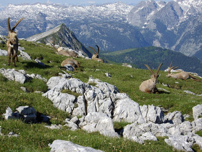 Einige Minuten unterhalb des Schneibsteins (2276m) treffen wir unerwartet auf ein Rudel von zehn Steinböcken, das sich durch uns überhaupt nicht aus der Ruhe bringen lässt.
