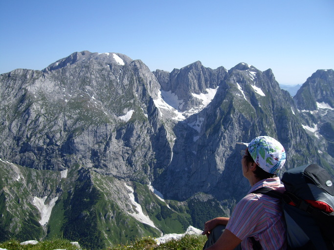 Die Aussicht vom Schneibstein ist großartig. Margit blickt auf den Gipfel des Göll zurück. Endlich ist der Grat sichtbar, über den wir am Dienstag zum Stahl-Haus gelangten. Trotzdem sollte man sich von der sichtbaren Länge nicht täuschen lassen, denn er ist stark geschwungen und teilweise verdeckt.
