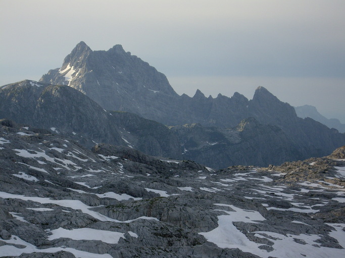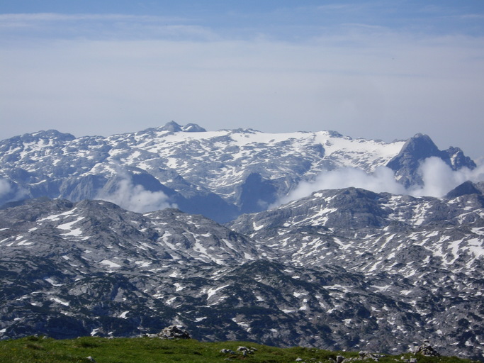 Im Westen bieten sich die Watzmannostwand und im Osten das Tennengebirge und dahinter der Hohe Dachstein dar.